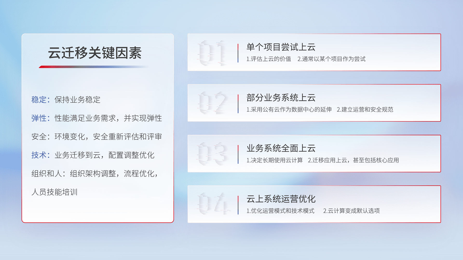 结合实际业务,,,从规划设计、、、云平台选型、、、云原生改造、、、、数据迁移、、、集成交付,,,迁移全过程为客户识别最佳上云路径,,,做好风险识别管理,,,设计网络架构、、身份权限、、、、安全审计合规、、、、操作审计、、、日志审计、、、监控告警策略、、、多站点容灾设计等,,,,对云上基础设施进行整体规划,,提升IT治理水平,,,,以满足弹性、、、高可用、、高性能的需求。。。。