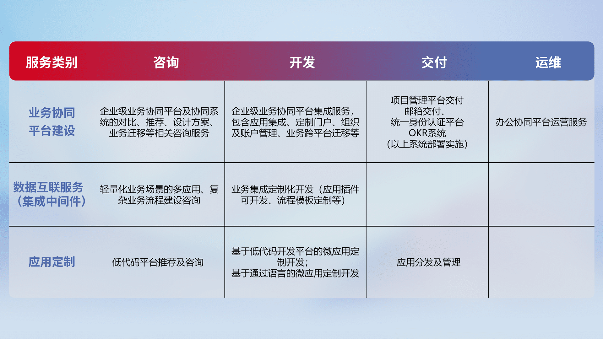 针对钉钉、、企微、、、、IDaas等平台级产品提供产品的规划、、、方案、、交付、、、定制化开发等服务,,实现如统一协同办公、、智能客户服务、、混合会议管理、、智能数据查询、、等业务场景,,实现数字化转型。。